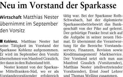Matthias Nester übernimmt im September 2011 Koblenzer Sparkassen-Vorsitz