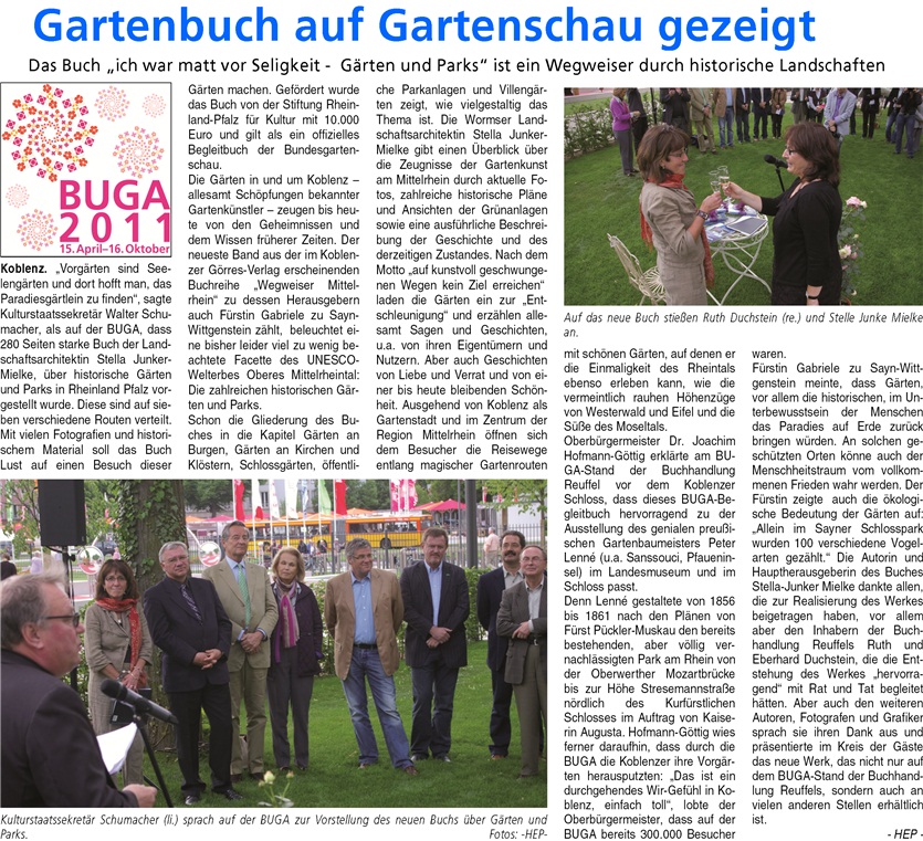 Neues Buch über Gärten und Parks – Weg-weiser durch historische Landschaften: Passt “genial” zu Lenné-Gärten auf Koblen-zer BuGa, so OB Hofmann-Göttig