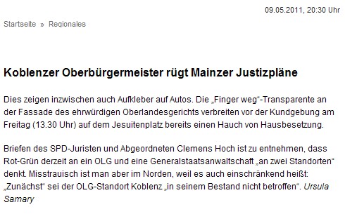 Mainzer Pläne nach Verlegung des Koblenzer OLG stoßen auf heftige Kritik: OB Hofmann-Göttig wird bei Koblenzer Protest-Demo am 13.05.2011 ebenfalls reden
