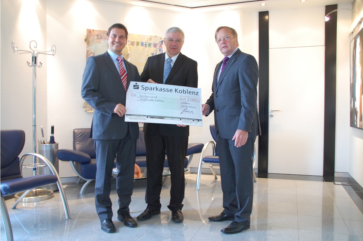 Das Foto zeigt v.l.: Matthias Nester (Stellvertretender Vorstandsvorsitzender Sparkasse Koblenz), OB Prof. Dr. Joachim Hofmann-Göttig und Manfred Graulich (Vorstandsvorsitzender Sparkasse Koblenz) bei der Scheckübergabe zugunsten der Städtewette Koblenz