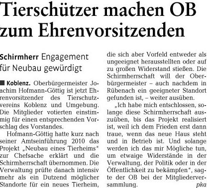 Koblenzer Tierschützer wollen Ober-bürgermeister Hofmann-Göttig zum Ehrenvorsitzenden machen