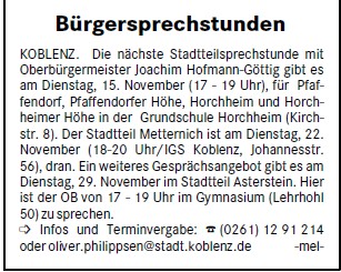 15.11./22.11./29. 11: Koblenzer Stadtteil-Bürgersprechstunden in Pfaffendorf/Horch-heim/Metternich/Asterstein von OB Hofmann-Göttig