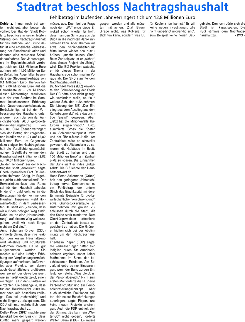 Koblenzer Stadtrat beschloss Nachtrags-haushalt – Fehlbetrag veringerte sich