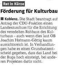 Koblenzer Stadtratssitzung (1): Förderung für Kulturbau