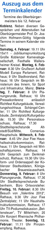 Terminkalender von OB Hofmann-Göttig bis 12.02.2012