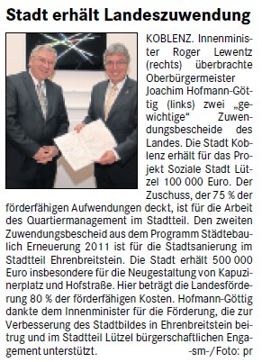 Koblenzer Projekt “Soziale Stadt Lützel” und Stadtsanierung Ehrenbreitstein erhal-ten vom Land Zuwendung von 650.000 Euro