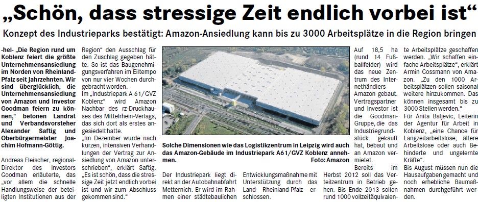 AMAZON-Ansiedlung bringt Koblenzer Raum bis zu 3.000 Arbeitsplätze