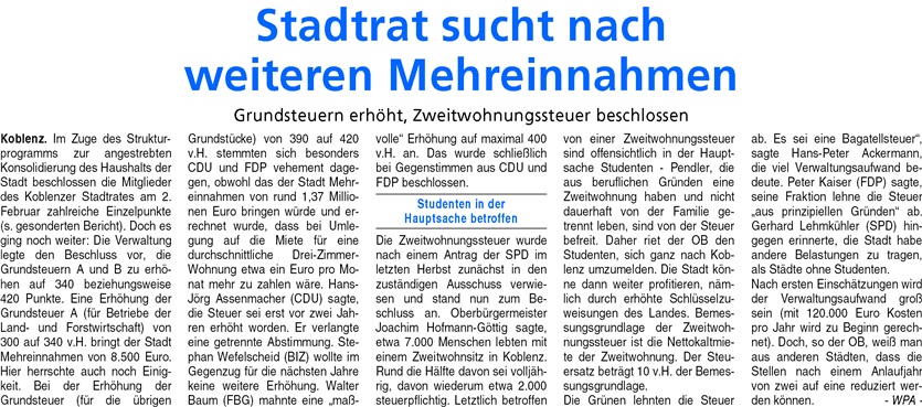 Koblenzer Stadtrat sucht nach Mehrein-nahmen
