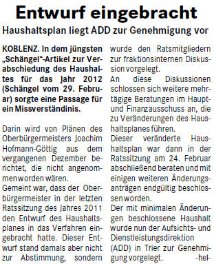 Koblenzer Haushaltsplan 2012 liegt zur Genehmigung vor