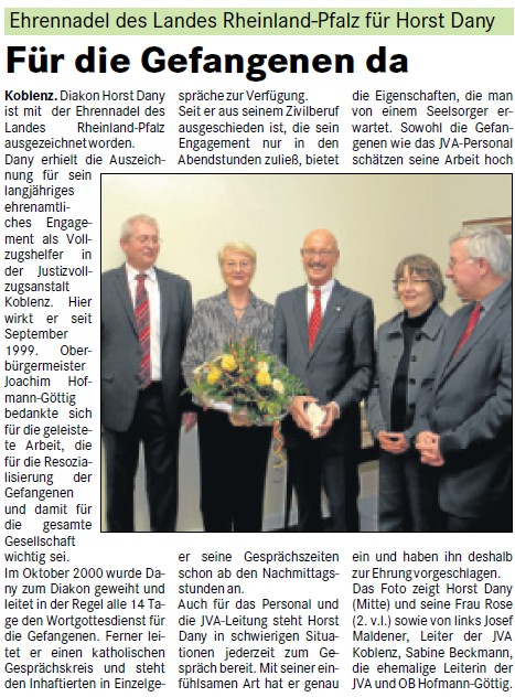 Ehrennadel des Landes Rheinland-Pfalz für Dekan Horst Dany für ehrenamtliche Tätigkeit in Koblenzer Justizvollzugsanstalt