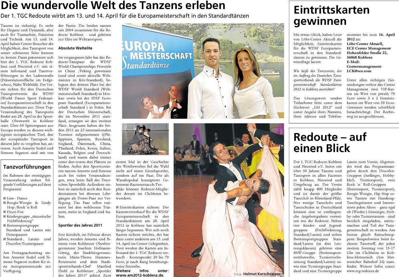 13./14.4. und 28.04.2012: Europameister-schaften/Standardtänze in Koblenz – Koblenzer Sportler-Paar des Jahres 2011 tanzt bei Weltelite