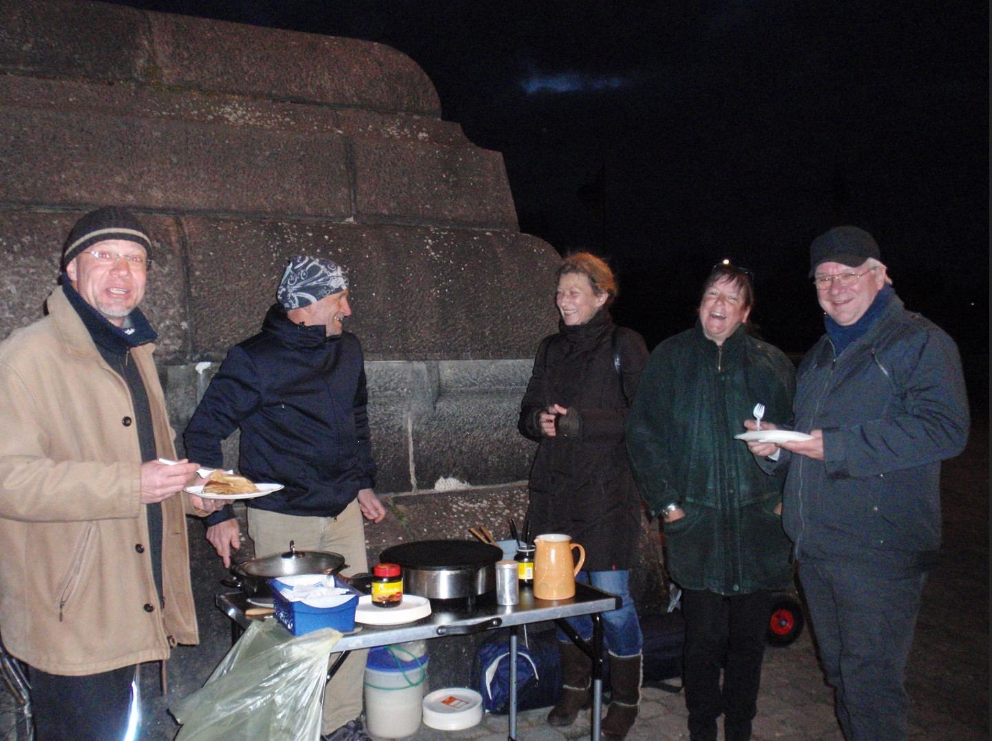 Das Foto zeigt, trotz der Kälte beste Stimmung am Deutschen Eck. Der Koblenzer Oberbürgermeister Prof. Dr. Joachim Hofmann-Göttig (rechts im Bild), die Leiterin des Umweltamtes Monika Effenberger (2. v.r.) und der Vorsitzende von ÖKOSTADT Koblenz e.V. Meyland Bruhn (links) lassen sich die vegetarischen Crepés schmecken.