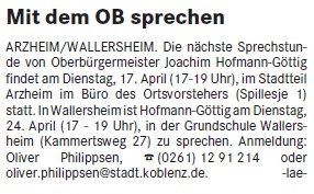 17.04./24.04.2012: Stadtteil-Bürgersprech-stunden von OB Hofmann-Göttig in Koblenzer Stadtteilen Arzheim und Wallersheim