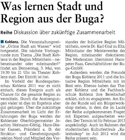 03.05.2012: “Grüne Stadt am Wasser”: Erfolgreiche Koblenzer BuGa-Veranstaltung aus 2011 wird auch 2012 fortgesetzt
