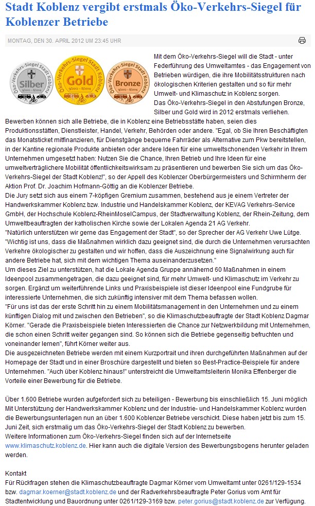 Stadt Koblenz vergibt erstmals Öko-Verkehrs-Siegel für Koblenzer Betriebe