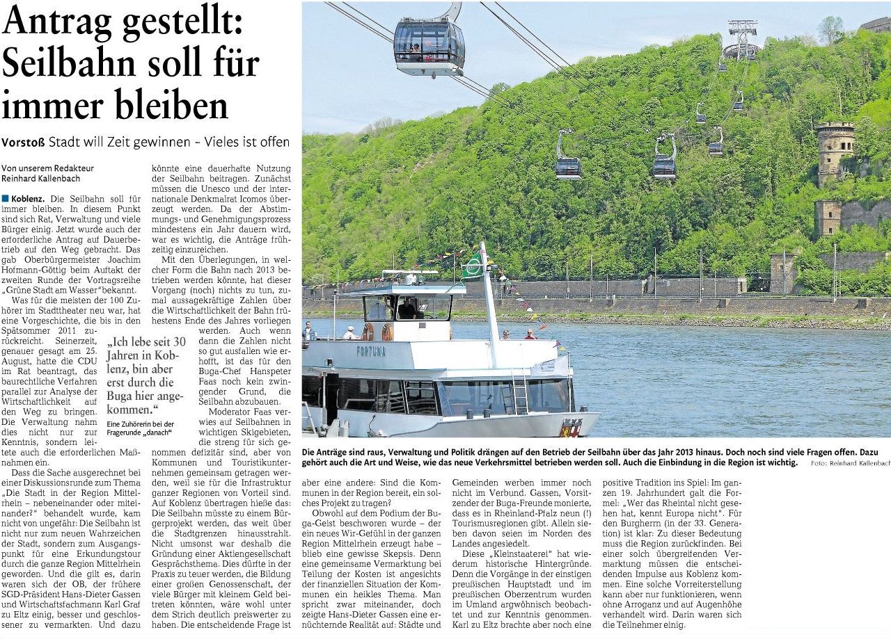 Koblenzer Seilbahn sollte für immer bleiben: Antrag auf Dauerbetrieb auf den Weg ge-bracht, so OB Hofmann-Göttig