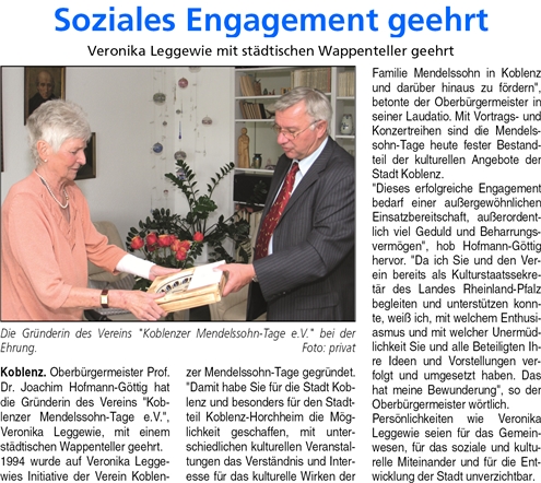 Gründerin der Koblenzer Mendelssohntage Veronika Leggewie von OB Hofmann-Göttig mit städtischem Wappenteller geehrt
