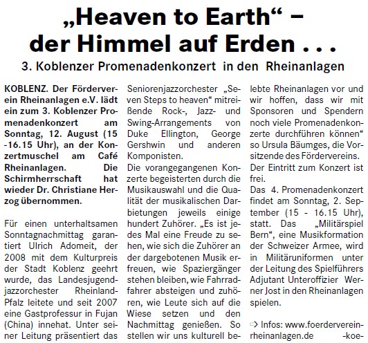 12.08.2012: Drittes Koblenzer Promenaden-konzert 2012 des Fördervereins Rheinan-lagen e.V. – “Heaven to Earth”