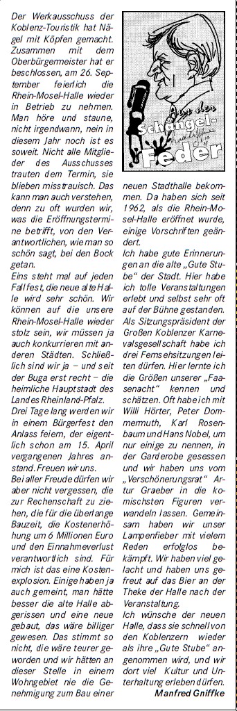 Koblenzer Ratsherr Gniffke zur bevorsteh-enden Eröffnung der Rhein-Mosel-Halle