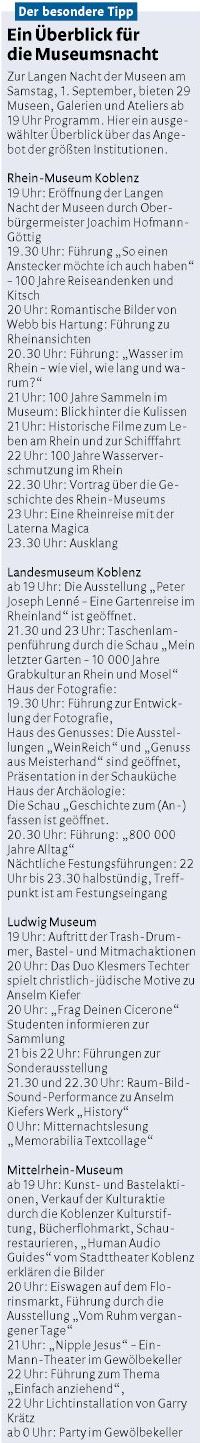 01.09.2012: Koblenzer “Lange Nacht der Museen” wird von der Aktivität von 29 Museen, Galerien und Ateliers getragen