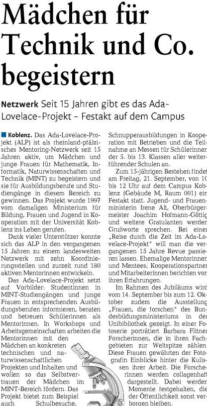 21.09.2012: Mädchen für Technik begeistern – 15 Jahre Ada-Lovelace-Projekt – Festakt auf Koblenzer Uni-Campus auch mit OB Hofmann-Göttig