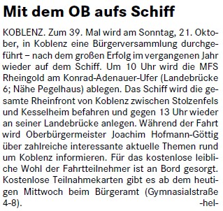 21.10.2012: Zum 39. Mal Koblenzer Bür-gerversammlung mit OB Hofmann-Göttig – Erneut auf dem Schiff