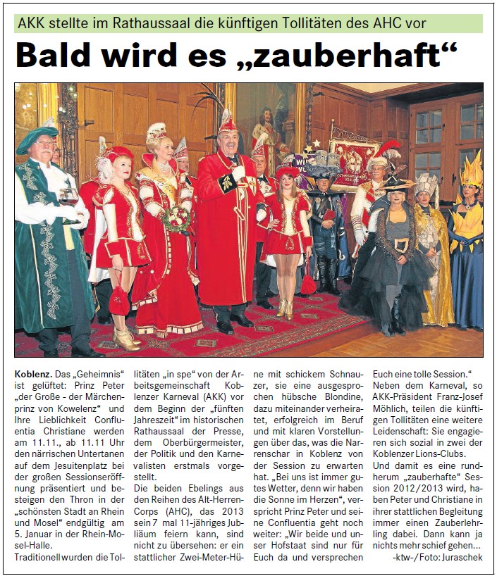 Arbeitsgemeinschaft Koblenzer Karneval (AKK) stellt “zauberhaftes” Tollitätenpaar für Session 2012/2013 vor