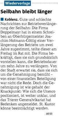 Zur zeitlichen Verlängerung der Koblenzer Seilbahn über Herbst 2013 hinaus