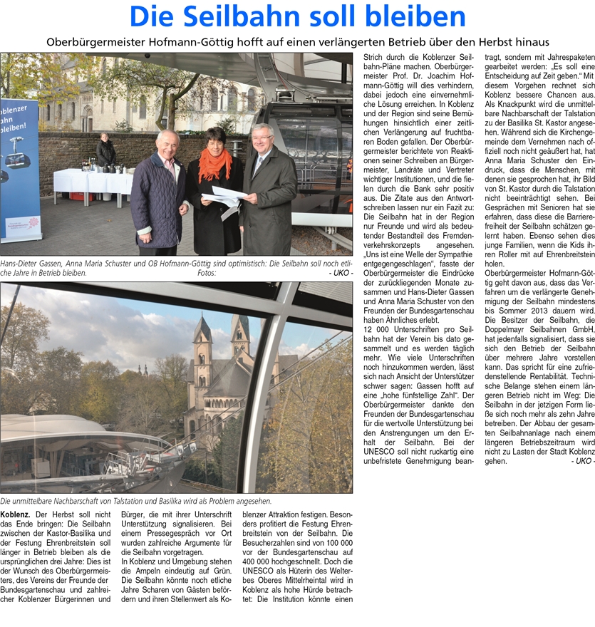 Die Koblenzer Seilbahn soll länger bleiben: BuGa-Freunde sammeln Unterschriften “Pro Seilbahn”