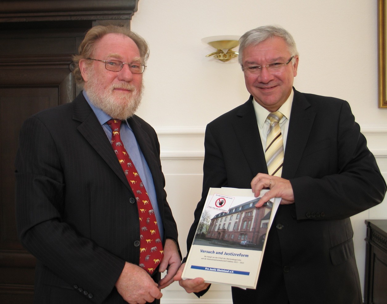 (Koblenz: 13.11.12) Oberbürgermeister Prof. Dr. Joachim Hofmann-Göttig erhielt heute Besuch von Dr. Peter Itzel, der in seiner Eigenschaft als Vorstandsmitglied der Vereins „Pro Justiz Rheinland e.V.“ zum OB gekommen war, um ihm die druckfrische Dokumentation „Versuch und Justizreform“ zu überreichen. Die Aktivisten für die bürgernahe Justiz hatten den Widerstand gegen die Justizreform und die Verlegung des OLG von Koblenz nach Zweibrücken gebündelt. Beim gemeinsamen Blättern in dem fast 190-seitigen Buch wurden direkt Erinnerungen an den gemeinsamen und erfolgreichen Kampf zum Erhalt von Gericht und Generalstaatsanwaltschaft wach. Itzel dankte dem OB für sein damaligen Engagement wie auch für seinen Beitrag zum neuen Buch.