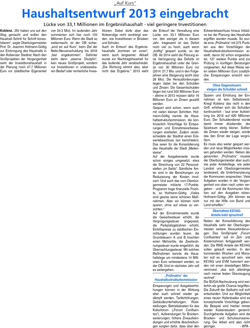 Zur Einbringung des Koblenzer Haushalts 2013 durch OB Hofmann-Göttig