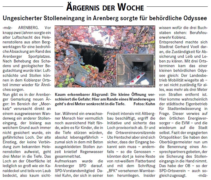 Ungesicherter Stolleneingang in Koblenz-Arenberg soll beseitigt werden