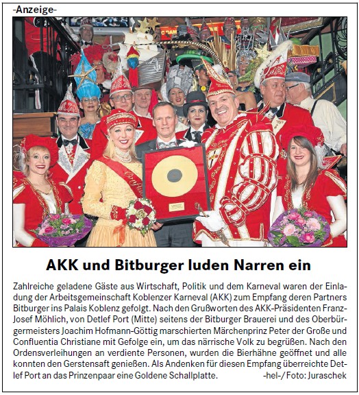 Arbeitsgemeinschaft Koblenzer Karneval (AKK) und Bitburger luden Narren ein