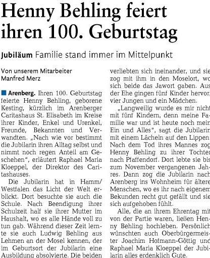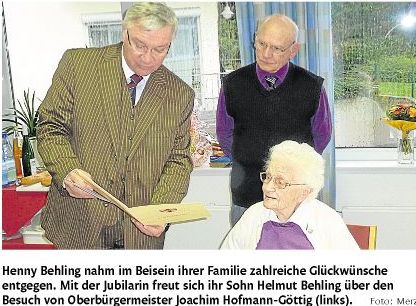 Koblenzerin Henny Behling feierte 100. Ge-burtstag: OB Hofmann-Göttig gehörte zu den Gratulanten