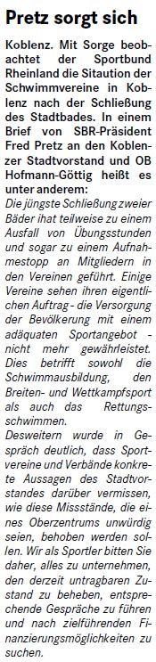 Zur Situation der Koblenzer Schwimmver-eine nach Schließung des Stadtbads