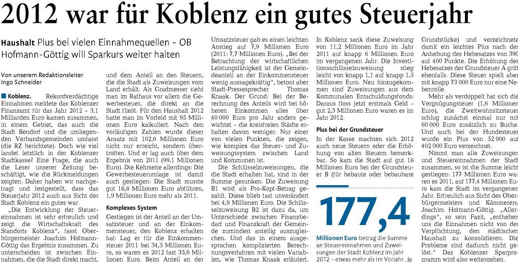 Für Koblenz 2012 ein gutes Steuerjahr: Zeigt Wirtschaftskraft des Standorts Koblenz, so OB Hofmann-Göttig