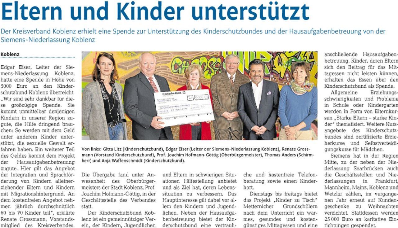 Koblenzer Siemens-Niederlassung spendete für Kinderschutzbund