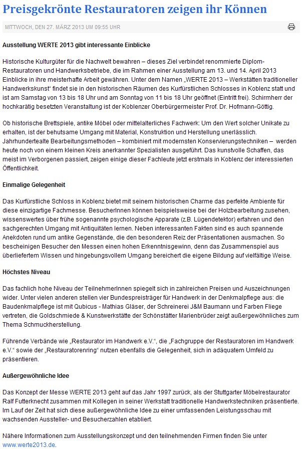 13./14.03.2013: Preisgekrönte Restauratoren zeigen ihr Können in Koblenz – Schirmherr OB Hofmann-Göttig