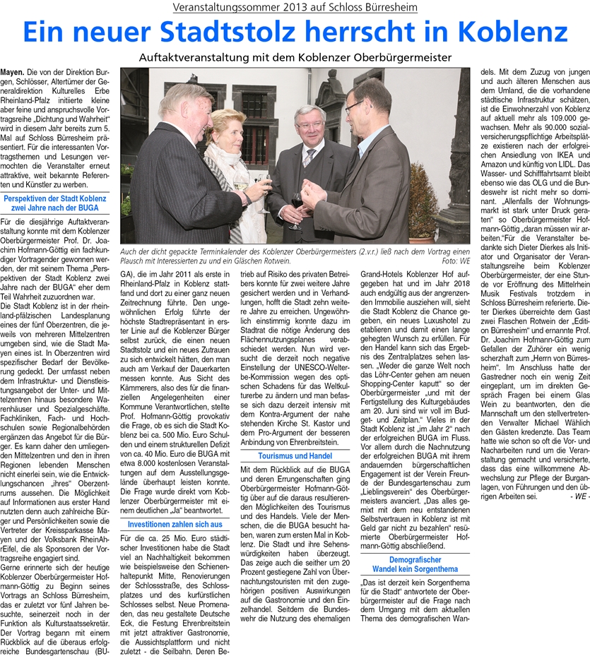 Perspektiven der Stadt Koblenz zwei Jahre nach der BuGa: Ein neuer Stadtstolz herrscht, so OB Hofmann-Göttig auf Schloss Bürresheim