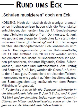 06.06.2013: “Koblenz-Tag” mit Auftritten ausgewählter rheinland-pfälzischer Schul-ensembles am Deutschen Eck – Schulen musizieren