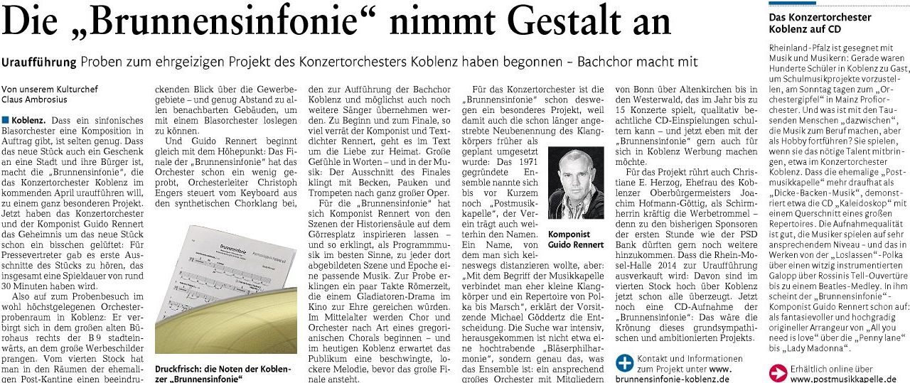 Probenbeginn zum ehrgeizigen Projekt “Brunnensinfonie”des Konzertorchesters Koblenz – Uraufführung April 2014 Rhein-Mosel-Halle
