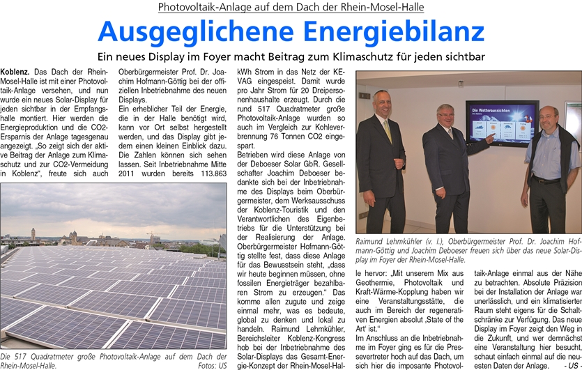 Photovoltaik auf Dach der Koblenzer Rhein-Mosel-Halle – ausgeglichene Energiebilanz mit neuem Display sichtbar für alle