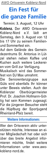 03.08.2013: AWO-Ortsverein Koblenz-Nord lädt zum Familien- und Sommerfest ein
