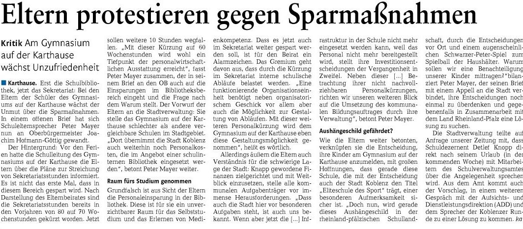Zur Diskussion über das Koblenzer Gymnasium auf der Karthause