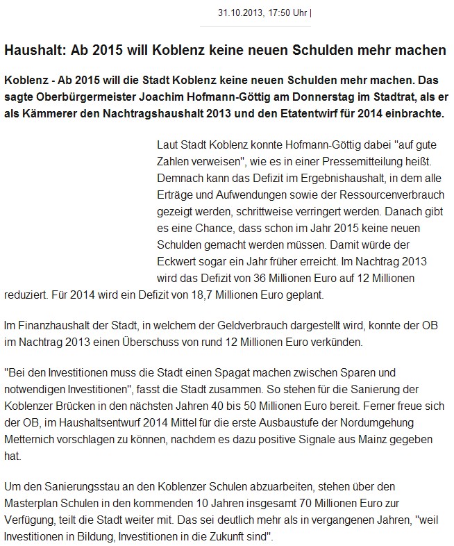 Koblenz will ab 2015 keine neuen Schulden mehr machen, so OB Hofmann-Göttig vor dem Stadtrat