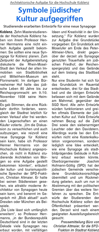 Koblenzer Studierende beschäftigten sich mit Planung einer neuen Synagoge in Koblenz