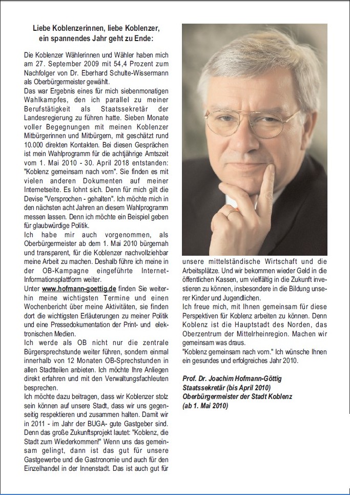 Hofmann-Göttig an alle Koblenzerinnen und Koblenzer: zum ausklingenden Jahr 2009 und guten Wünschen für 2010