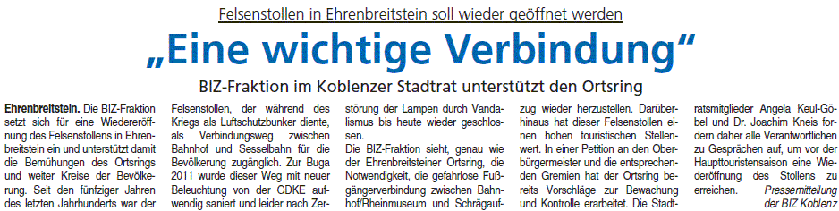Zur Diskussion um die Wiederöffnung des Felsenstollens der Koblenzer Festung Ehrenbreitstein