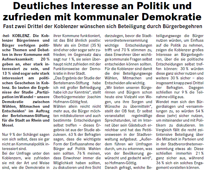 Zur Zufriedenheit der Koblenzer Bürger-schaft mit der kommunalen Demokratie – Vielzahl von Wegen zur Übermittlung von Sorgen und Wünschen bereits derzeit mög-lich, so OB Hofmann-Göttig