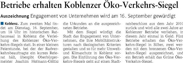 16.09.2014: Auszeichnung für Betriebe durch Koblenzer Öko-Verkehrs-Siegel